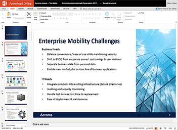 Acronis Files Advanced zapewnia przedsiębiorstwom prosty, kompletny i mobilny dostęp do plików, ich synchronizację i współdzielenie, udostępniając wysoką skalowalność użytkowników i serwerów, wszechstronną ochronę środowiska IT oraz mechanizmy granularnej polityki zarządzania użytkownikami, aplikacjami i danymi.
