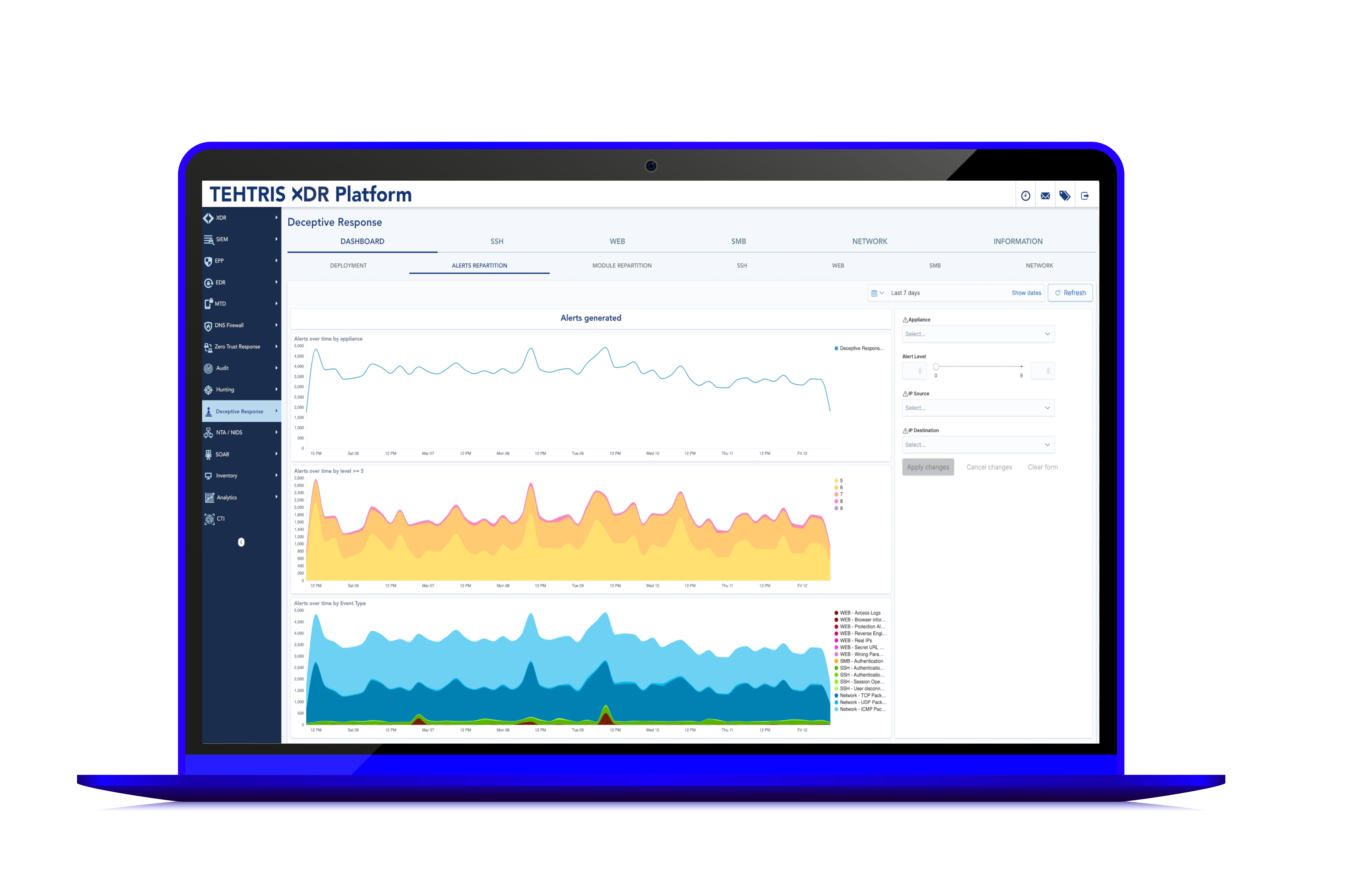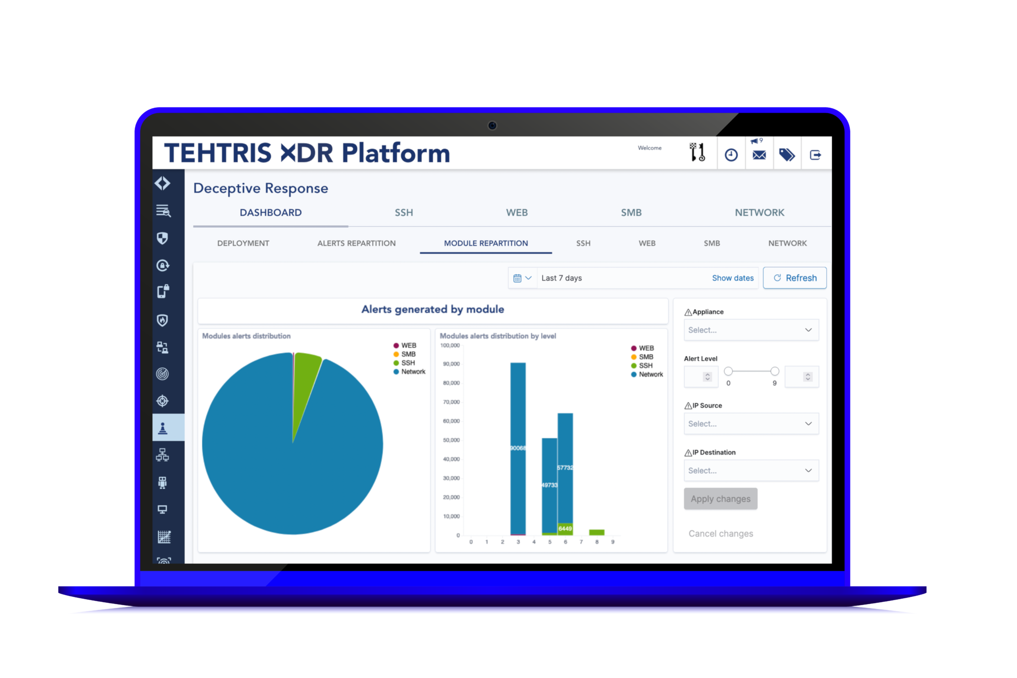 TEHTRIS Deceptive Response wdraża flotę honeypotów, które są w pełni zintegrowane z rozwiązaniem TEHTRIS XDR Platform, wyposażonym w technologię SOAR, ekspercką wiedzę o cyberzagrożeniach, polowanie na nowe zagrożenia, kontrolę zgodności, zarządzanie incydentami i wiele więcej.
